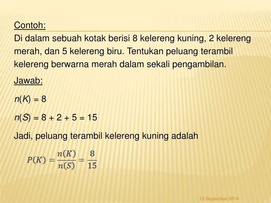 Belajar mudah peluang gabungan dua kejadian hai geennggss… apa kabar kalian?? Akan dicari peluang yang terambil bukan kartu keriting dalam seperangkat kartu bridge. Terdapat 1 set kartu bridge sebanyak 52 buah. Tentukan peluang terambilnya kartu bukan as ! Contoh soal peluang yang dibahas adalah peluang kejadian dadu, peluang kartu bridge, bola berwarna, kelereng yang disertai pembahasannya.